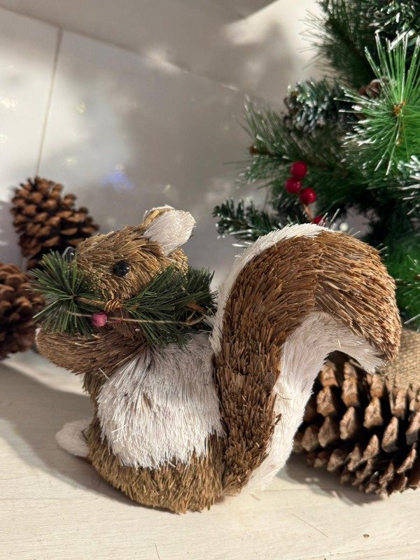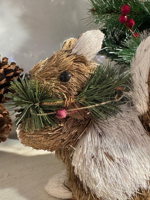Material: paja natural, plástico, alambre, tela, terciopelo, lana, ojos artificiales.