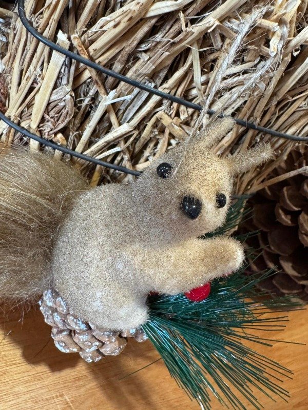 Material: paja natural, plástico, alambre, tela, terciopelo, lana, ojos artificiales.