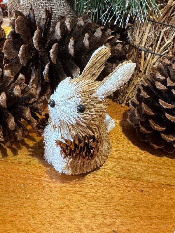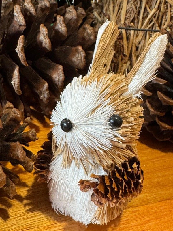 Material: paja natural, plástico, alambre, tela, terciopelo, lana, ojos artificiales.