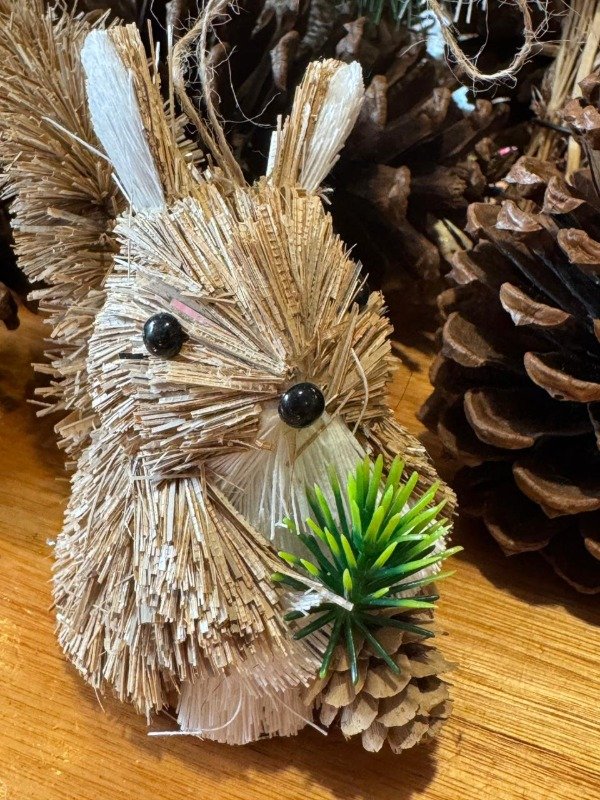 Material: paja natural, plástico, alambre, tela, terciopelo, lana, ojos artificiales.