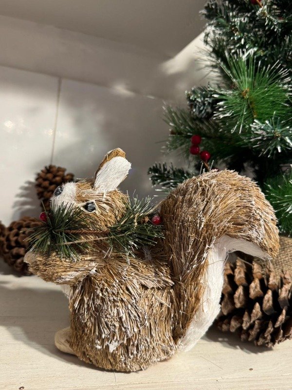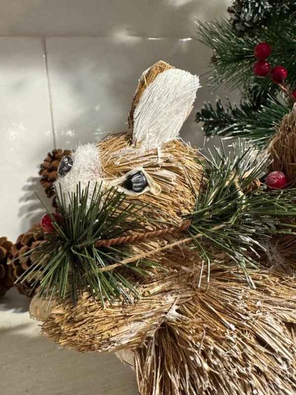 Material: paja natural, plástico, alambre, tela, terciopelo, lana, ojos artificiales.