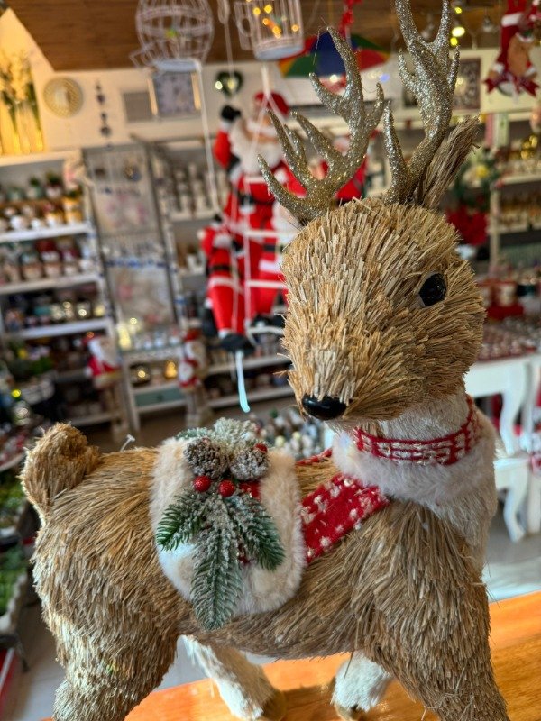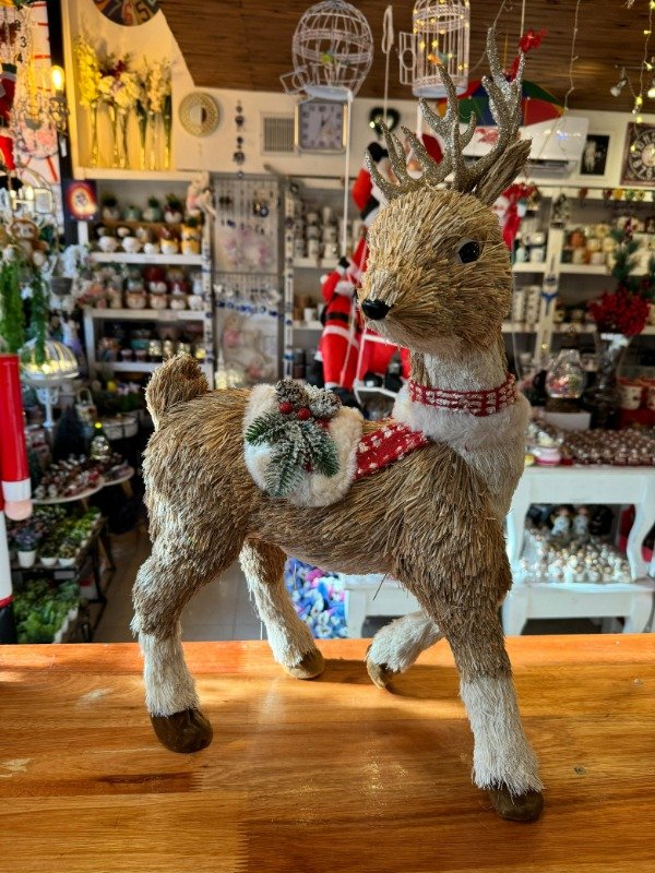 Material: paja natural, plástico, alambre, tela, terciopelo, lana, ojos artificiales.