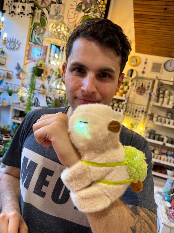 Capibara que abraza suavemente el brazo como pulsera y presionando su panza suena la canción del capibara con juego de luces
