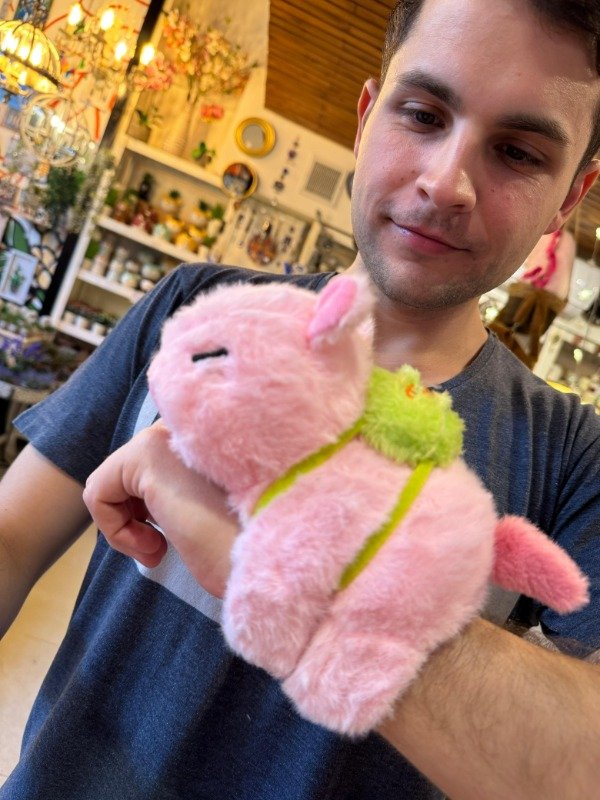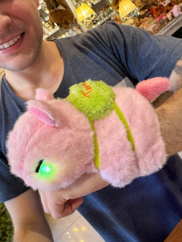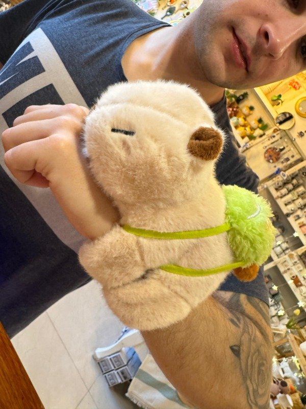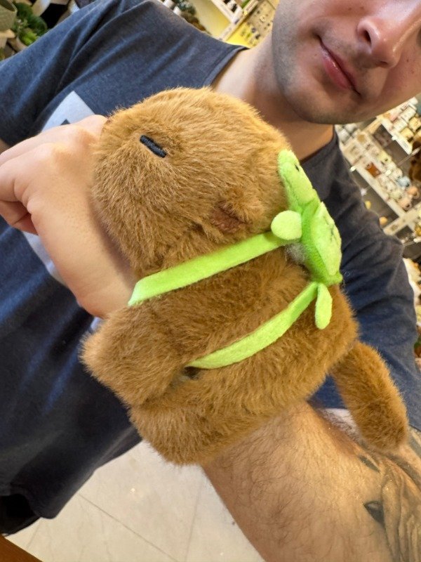 Capibara que abraza suavemente el brazo como pulsera y presionando su panza suena la canción del capibara con juego de luces