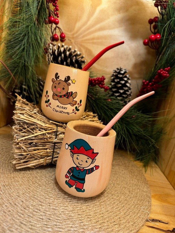 Mate de madera pintado a mano, con diseños surtidos de Papá Noel, Renos, Gnomos, Ayudantes de Santa.